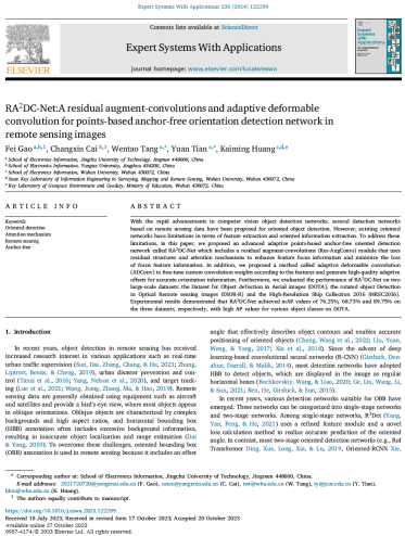 学院唐文涛博士研究团队,在基于人工智能的遥感图像目标识别研究领域取得重要进展。研究成果RA2DC-Net:A residual augment-convolutions and adaptive deformable convolution for points-based anchor-free orientation detection network in remote sensing images”在国际著名学术期刊Expert Systems With Applications上发表,期刊为中科院一区Top期刊,影响因子8.5论文第一作者为电子信息工程学院2021级电子信息专业联培硕士研究生高飞,通讯作者是唐文涛博士和田原教授。这是我校首次以第一单位在该刊物上发表人工智能领域方面的文章。