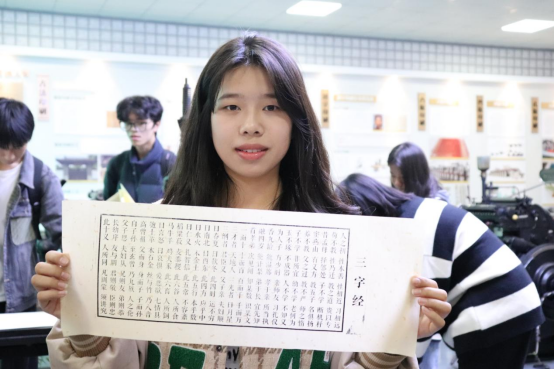 “太棒啦!古人太伟大了!”参观了最早的雕版印刷复制品《金刚经》和最早的活字印刷机——谷登堡印刷机(复制品),同学们都为古代印刷术精湛的技艺和古人的智慧感到惊叹不已。部分同学还在老师的指导下采用手板式印刷机亲自印制了《三字经》。