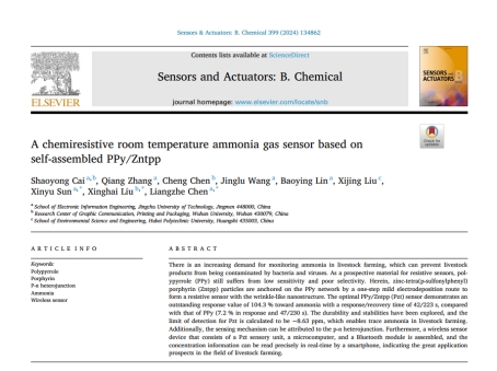 近日,荆楚理工学院电子信息工程学院陈良哲博士/副教授在国际顶级学术期刊《Sensors and Actuators B: Chemical》上发表研究论文,题为“A chemiresistive room temperature ammonia gas sensor based on self-assembled PPy/Zntpp”。该刊物是一本跨学科期刊,致力于发表化学传感器和生物传感器、化学致动器和分析微系统领域的研究和发展,属于中科院分区1区Top期刊,在传感器领域具有极高的学术影响力,2022-2023年度的影响因子为8.4。