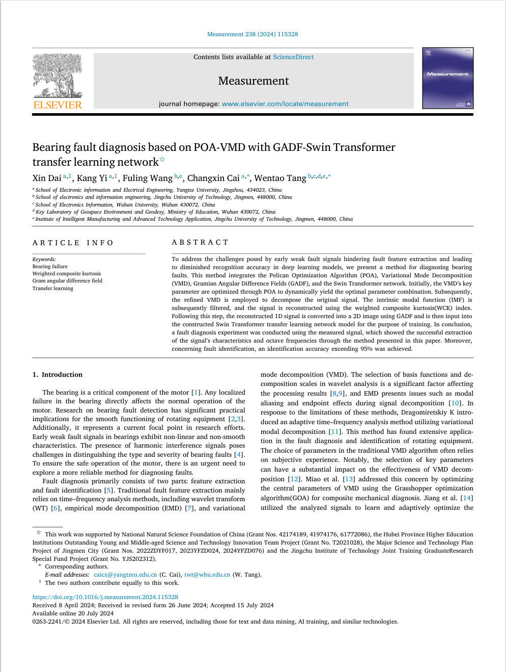 学院唐文涛教授研究团队,在基于人工智能的电机故障诊断领域取得重要进展。研究成果“Bearing Fault Diagnosis Based on POA-VMD with GADF-Swin Transformer Transfer Learning Network”在国际著名学术期刊Measurement上发表。Measurement是ELSEVIER旗下的国际权威期刊,主要刊发故障诊断与仪器仪表等方面的最新进展和评论文章,为中科院SCI二区TOP期刊,最新影响因子为5.2。论文第一作者为2023级联培研究生戴鑫与2021级联培研究生易康,导师唐文涛教授和长江大学蔡昌新副教授为该文通讯作者。