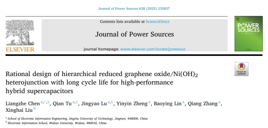 近日,荆楚理工学院亚洲视频一区二区陈良哲博士/副教授在国际能源领域Top期刊《Journal of Power Sources》上发表研究最新研究成果,题为“Rational design of hierarchical reduced graphene oxide/Ni(OH)2 heterojunction with long cycle life for high-performance hybrid supercapacitors”。论文的第一作者/通讯作者为陈良哲副教授,研究生涂倩和本科生鲁晶瑶为的共同第一作者,荆楚理工学院是论文的第一通讯单位。该论文还获得湖北省高等学校优秀中青年科技创新团队项目和荆门市科技计划项目的资助。《Journal of Power Sources》刊物致力于发表关于电源技术、能源存储与转换等方面的研究和发展,2023-2024最新影响因子为8.1,属于JCR Q1分区、中科院2区的Top期刊,在能源领域方面具有极高的影响力。