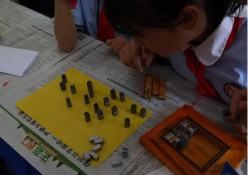 随后,活动进入实践操作环节。在印团队队长的引领下,学生们分组进行,由印团队的专业成员一对一指导。学生们手持古老的印刷工具,亲手体验了活字印刷的全过程,从选字排版到上墨印刷,每一步都凝聚着他们的专注与热情。当一张张承载着学生汗水与智慧的印刷品展现在眼前时,现场响起了阵阵掌声与欢呼声,学生们脸上洋溢着成就感与喜悦。