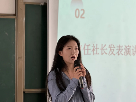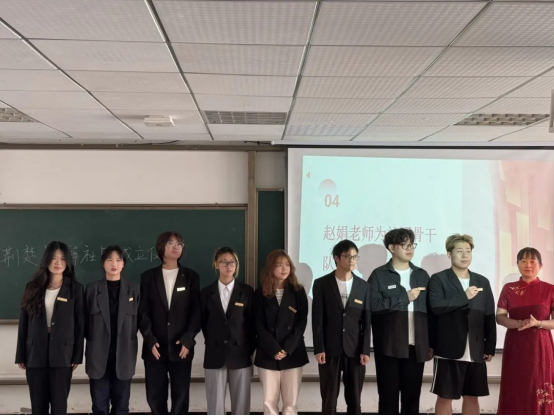 随后,指导教师赵娟为辩论队骨干成员授队牌、授旗并发表讲话。赵娟老师宣布了荆楚思辨社社团成立,她希望同学们能在这里以理性的态度、批判的思维,探讨各种问题,提升思考力和表达力,并在全体成员的共同努力下,为我校辩论和学术交流增添浓墨重彩的一笔,共同书写荆楚思辨社的美好未来。